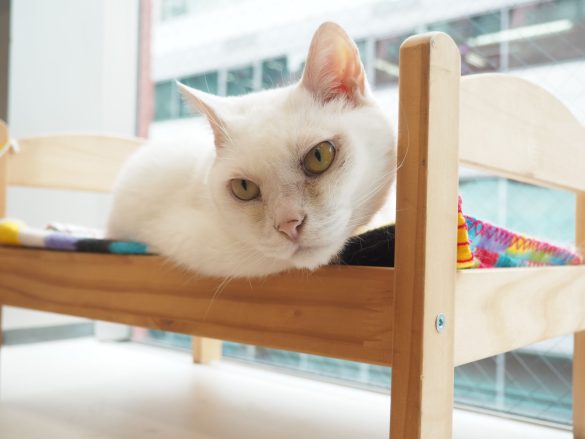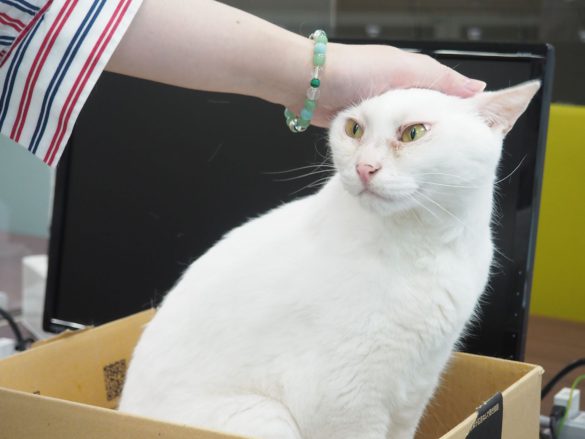 その「アソビゴコロ」の象徴ともいえるのが、ねこ専務こと、ダイゴロウかもしれません。8歳の白いオス猫で、社長と一緒に出勤し、日々仕事に邁進(まいしん)しています。