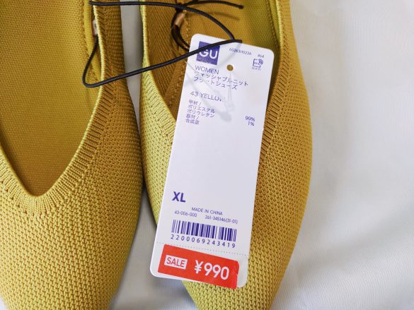 今回、筆者が購入したGUの「ウォッシャブルニットフラットシューズ」のカラーはイエロー。サイズはXL。それゆえ、こちらの色とサイズのみセール価格990円(税込)で購入できました。(筆者の足のサイズは、24.5cmでピッタリ!かなりラッキーでした)
