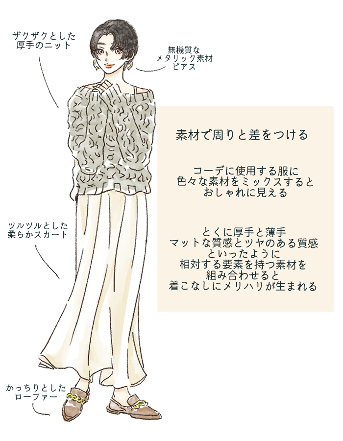 ・体の肉感を拾わない、ハリ・立体感のある素材を選ぶ
