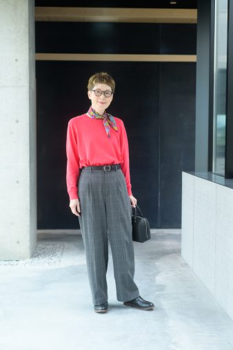 60を過ぎて、赤やピンクを着るようになりました。赤が入ると、顔がパッと明るい雰囲気になりますよね。20代の頃は肌、髪にツヤがあるけど、今の年齢になると補っていかなければいけない。常に「今だったらどう着る?」っていうのも考えてコーディネートを考えるようになりました。