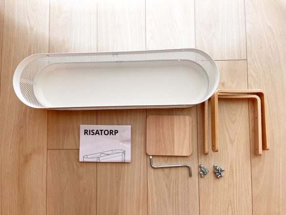 筆者のイチオシは「リーサトルプ デスクオーガナイザー」(2,999円)。スチール素材×メッシュという点はバスケットと同じですが、脚付きの横長収納という一風変わったデザインになっています。 幅50×高さ17×奥行き16cmと存在感たっぷりのサイズで、公式サイトの画像で見るよりも実物の方が大きく感じました。使い道を決めないまま見た目に惹かれて購入したのですが、この大きさがなんとも絶妙で使い勝手抜群なんです。