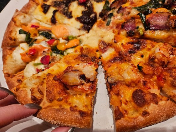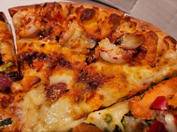 ガーリックの風味とスモーキーな香りで少し大人めな贅沢ピザ。旨み成分たっぷりのエビが、ぷりっぷりで宅配ピザとは思えない!4種のチーズを使っているのに、くどくなくパクパク食べられます。口の中いっぱいに大きめで肉厚なエビを頬張るのは贅沢で特別な食卓です。