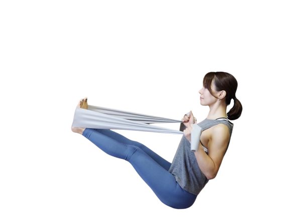ひざを立てて座ったら、「エクササイズゴム」を足裏にかけます。両端をそれぞれの手で持ち、ゴムを引っ張れば、腕や背中のトレーニングに。