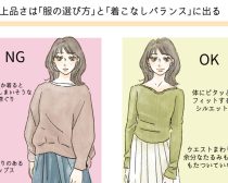 ゆったりとしたシルエットの服でも、上質に見える服には余計なシワやヨレた箇所がまったくありません。オーバーニットやワイドパンツにしても、身につけたときに裾がダブついていたり、生地がたるんで腰まわりだけが膨らんで見えたりするようなものはNG。シルエットにかかわらず、すっきりとした輪郭のある服を選びましょう。【ファッションのお悩み募集!】