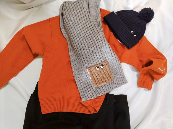 セーターは着心地も大変良くて暖かく、これからヘビロテすることになりそうです。マフラーには、ポケット上の目のモチーフがアクセントとなっており、こちらも可愛いです。