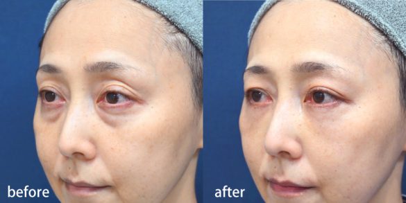 手術治療は、眼窩脂肪の除去と皮下の脂肪を補う方法(経結膜脱脂+脂肪注入)が多く行われています。この方法では、脂肪除去後に新たな脂肪を注入して皮膚の透け感をカバーしつつ、不自然な凹凸ラインを美しく滑らかに整えることができます。