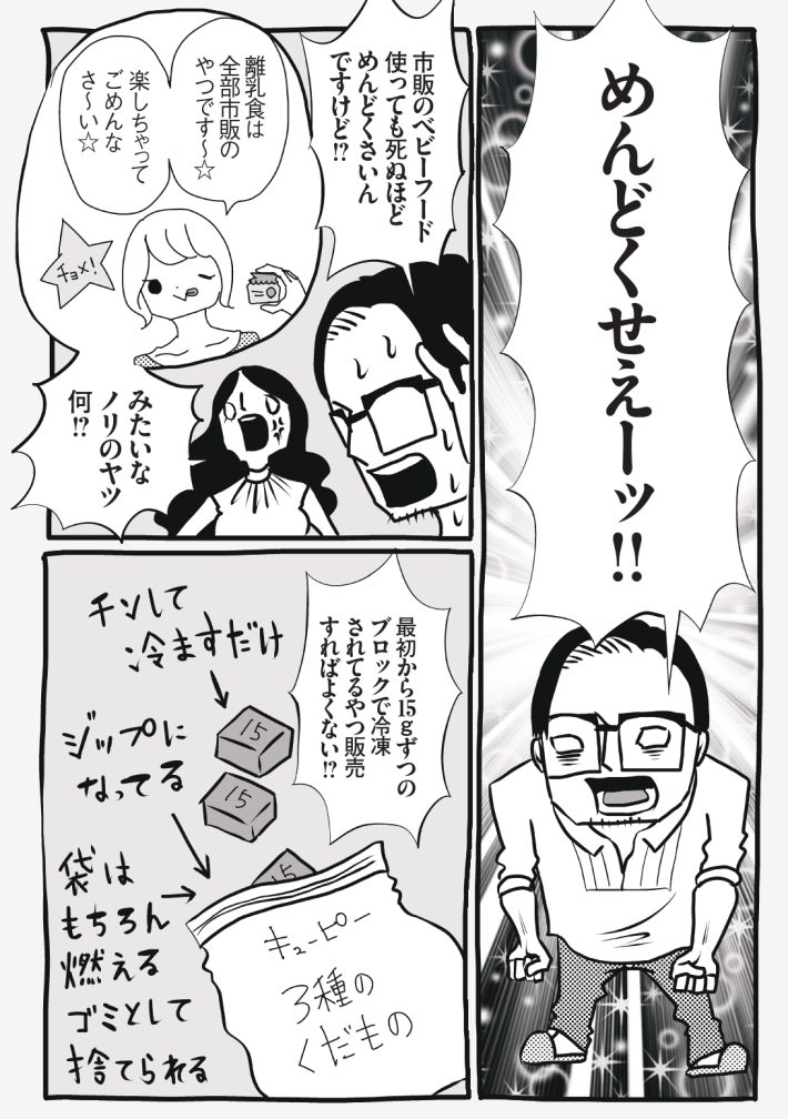 第4巻発売にあたっては「離乳食は市販のやつでもめんどくさいし、オムツはダサい柄がジャマして尿が出たよサインが見づらい。ただでさえ限界状態になる0歳児育児で、それを補助するためのグッズが明らかに使いづらいって、社会が育児世帯に嫌がらせをしているとしか思えない!! という過酷な条件下で一日20時間育児を続けているチャラヒゲの『過労死ってこんな感じなのかな……』の一言が、1日4時間しか育児していない私の胸に深く鋭く突き刺さる――………!!」とコメント。
