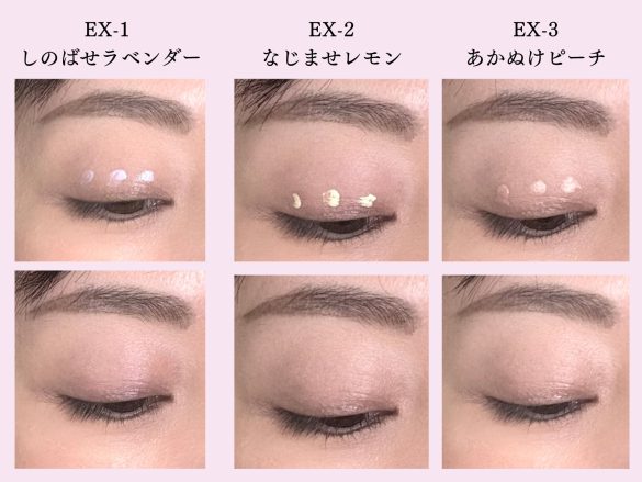 アイシャドウが赤み寄りになりやすい方におすすめなのは、「EX-2 なじませレモン」。ツヤとハリ感を与えながら赤みを抑えます。