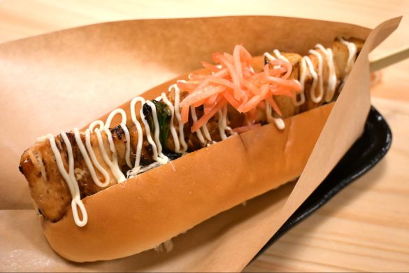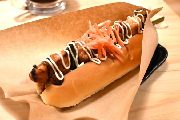 鶏肉の脂身とタレがパンに沁み込み、ぜいたくな味わいに。そしてパンに敷いてある白ネギのスライスと紅ショウガがなんとも合います。