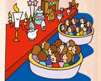 名曲「ひとりぼっちの晩餐会」を歌うベル。皿たちが踊り、ベルをもてなす。