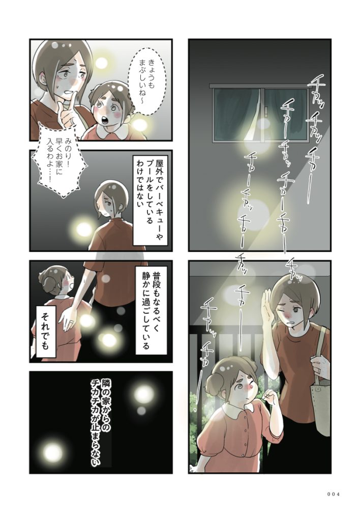 春奈と娘のみのりが車で帰宅すると、決まってガレージを標的に光が点滅します。まだ小さな娘の声がお隣に響くのかもしれないと危惧し、春奈は努めて静かに生活します。が、立山家に向けられるチカチカは止まらずに、むしろ執拗(しつよう)になってくるのです。