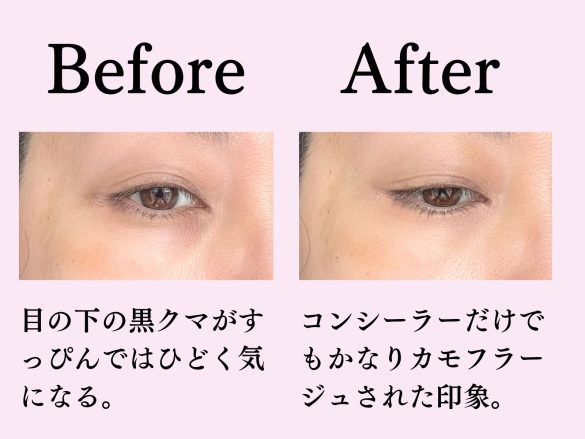 上の画像をご覧いただくと伝わるかと思いますが、疲れて見えた黒クマに自然な血色感が出ることでこれ1本でも肌に自然に溶け込むようにカバーできた印象があります。また、シワに入り込んでしまうこともありませんでした。