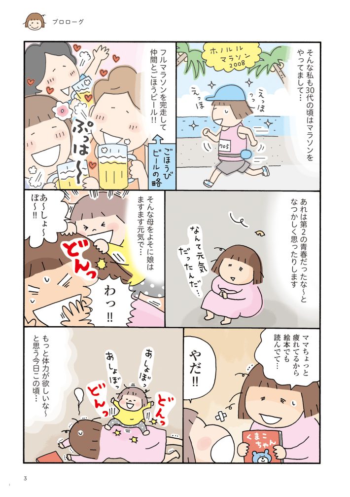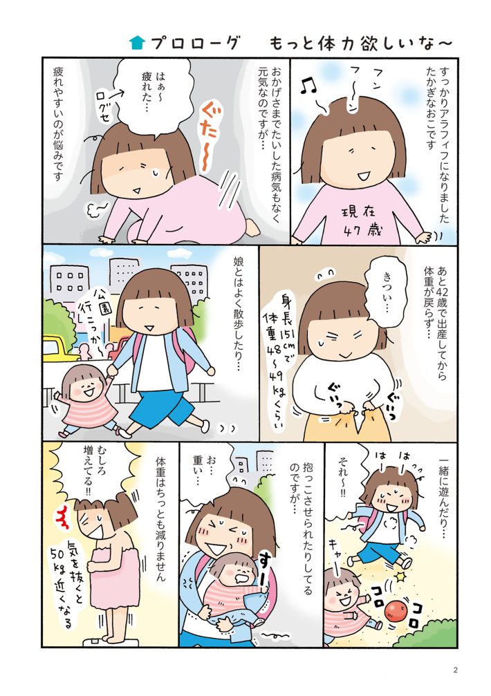 著者のたかぎなおこさんは42歳で出産、現在47歳ですが、日々、体力ダウンを感じているといいます。子供はまだ幼く、子育てにも体力が必要な時期。「疲れた」なんてつぶやいている場合ではないのです。