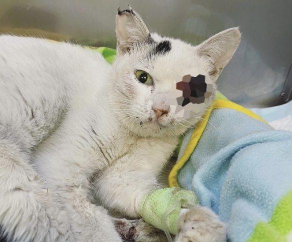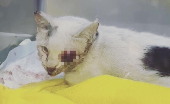 よもぎちゃんは顔中、血だらけ。大きな恐怖を感じたからか脱糞をし、後ろ足は裂傷。左眼球は飛び出ていました。