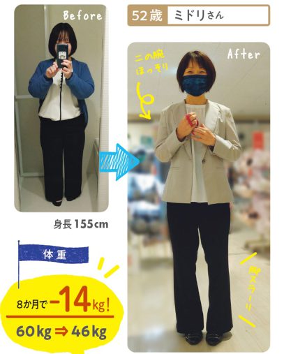「しっかり食べておなかがすかないので、ダイエットをしている感覚がないまま続けることができました。ガマンなしで、気づいたら14kgやせていて、ウエストも14cm減してた、という感じ。二の腕が7.5cm細くなり、好きなジャケットを着こなせるようになったのもうれしいです!」(ミドリさん)。