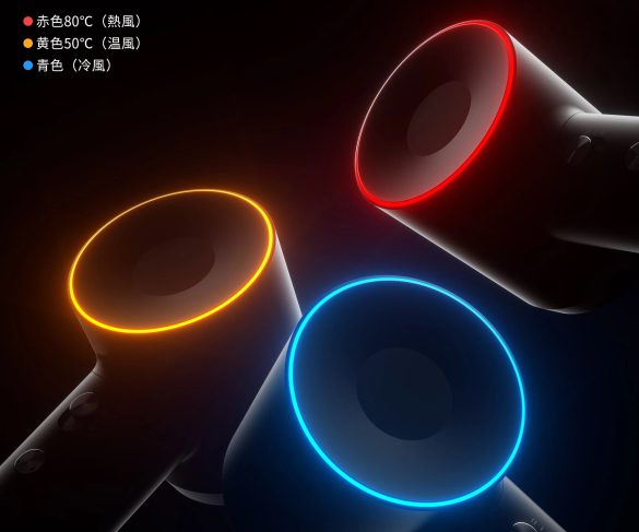 熱風(80℃)は赤色、温風(50℃)はオレンジ色、冷風は青色となり、2秒長押しで冷風と熱風を交互に循環(ライトリングはレインボーカラー)させることも可能です。