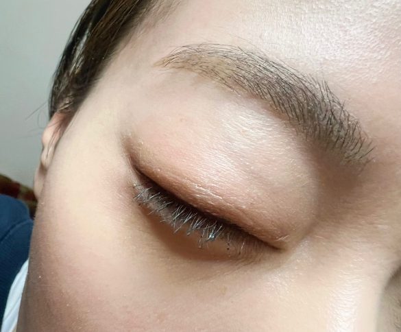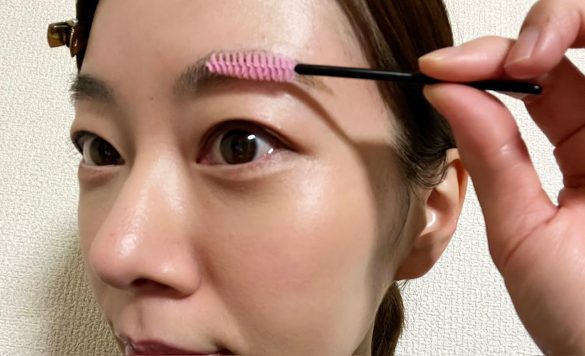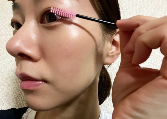 「スクリューブラシ」をジグザグ動かさず、まつ毛の根元近くから毛先に向けてスーッと軽くとかすように使うといい感じ。