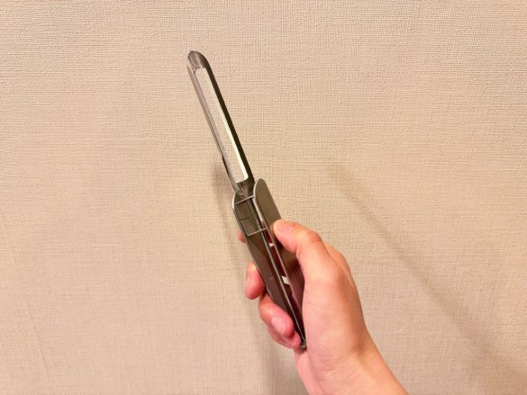 筆者が購入したのは、サンクラフトという会社が販売している「ロングピーラー+プラス」(税込2,640円)。T字型のピーラーは横向きに刃がついていますが、こちらは縦についていて、なんの説明もないと一見用途がわかりません。