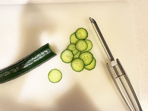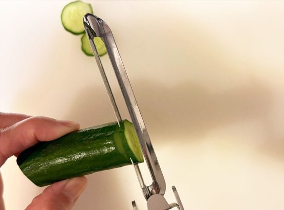 きゅうりのスライスもお手のもの。まな板の上に食材を置かなくても空中でカットができるため、ボウルやお皿の上でおこなえば洗い物も少なく済みます。