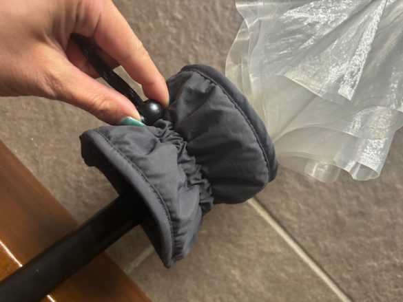 取り付け方は簡単で、ひもを緩めて傘の取っ手部分にストッパーで固定します。髪の毛をくくるシュシュのようなゴムではなく、ストッパーをスライドさせて紐を絞り、固定する仕様です。