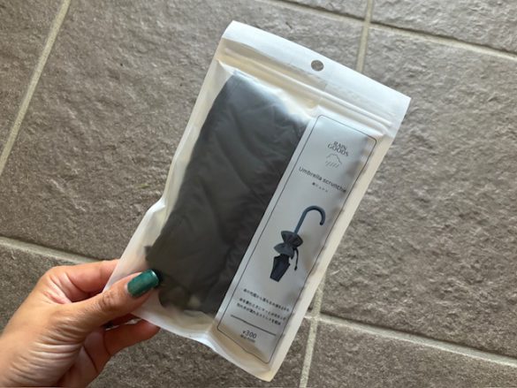 店頭で見たときに、何に使う商品なのか気になった「傘シュシュ」(税込330円)は、濡れた傘の水気をサッと拭きとることができるアイテムです。傘につけたまま持ち運びができるので別で持ち歩く必要がないのも嬉しいです。
