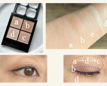 (1)aをアイホール全体に重ねてから、同じ箇所にd、次いでcと順番に重ねていく。使用するツールはブラシを使った方が自然な陰影が出るのでおすすめ。