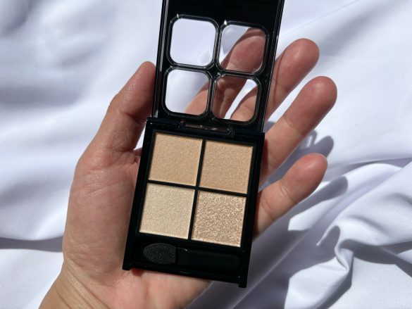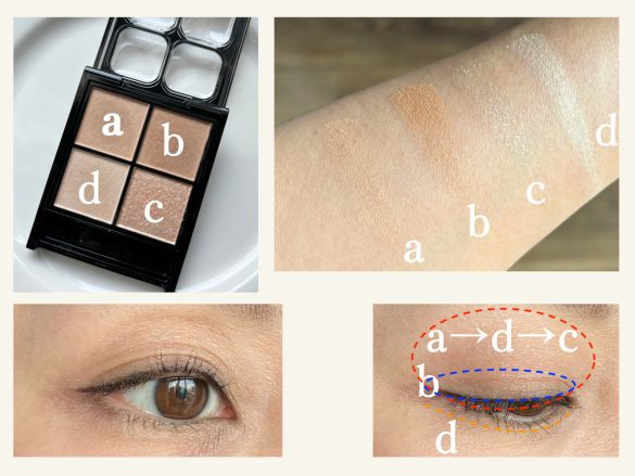 深い色を含んでいない、いわゆる、締め色なしのアイシャドウパレット。上の2つの色はマットな質感、下の2つの色はラメを含んでいますが、左が繊細なラメでツヤが出る質感。右は公式サイトによると大粒ラメということですが、実際に肌に塗ると左のラメよりも輝きが強く感じられますが、通常の大粒ラメよりももう少し粒が小さい印象です。