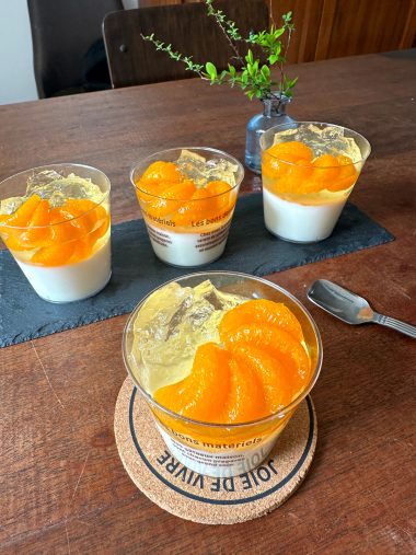 「下はあっさりしたレアチーズケーキのようなヨーグルトゼリー、上は缶詰を使ったみかんゼリー。時間差でかためず、バラバラに作ってのせるだけなのでめっちゃ簡単!!」(山本ゆりさん)