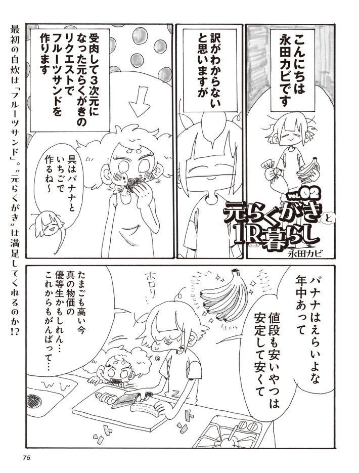 18か月ぶりに1人暮らしを再開することになった生きづらい系エッセイ漫画家・永田カビ。「自炊がんばるぞ~!!」と意気込む永田のもとに、なぜか具現化した元らくがきが現れ、おいしく、おかしな1人暮らし(?)を始めることに……。