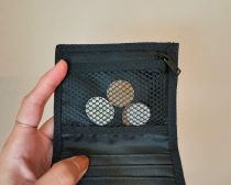 サイズは約11×9.5cm。ミニサイズなだけでなく厚みがないので、ミニバッグやサコッシュにもスッと入ります。ポリエステル製で軽く、サイズ・重さ共に荷物の邪魔になりません。