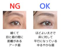 細くて目と眉の間に距離があるアーチ眉をしていると、古臭く見えてしまいます。今のトレンドは太眉で床に対して平行を意識しつつも、ゆるやかなカーブを描く眉です。この機会に眉の形をぜひ見直しましょう。