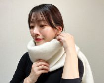 完成後、自分では結び目が見えないので、マフラーの両端の長さやバランスをしっかり整えてから回転させるのがポイント。
