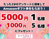<回答&プレゼント応募期間> 2024年11月15日(金)~12月5日(木)昼11:59 ※当選者の発表はメールでのギフトコード送付をもってかえさせていただきます <応募資格> ・女子SPA!の無料会員であること ・下記のアンケート回答フォームにてアンケートにご記入いただいた方 <新規会員登録orログインはコチラから> 会員特典ついてはコチラをチェック!⇒【女子SPA!無料会員募集中】会員登録するだけで様々な特典がもりだくさん!新規会員登録はこちらから>>