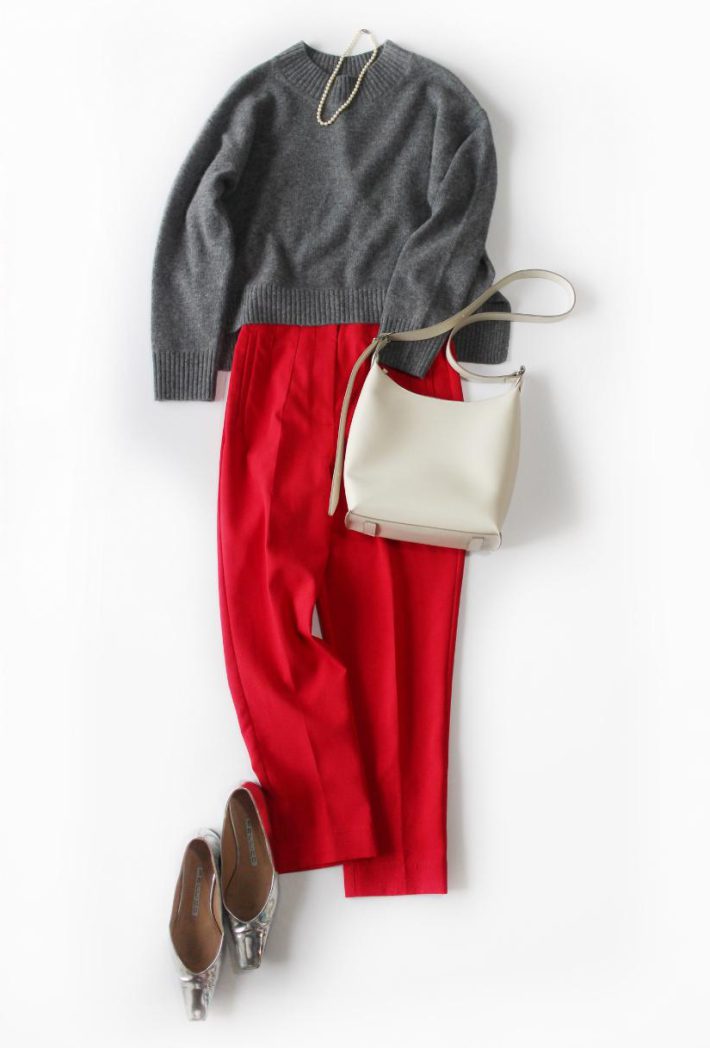 グレーや白など無彩色は色ものの邪魔をしない色です。コーディネートに「同じ色を2ヶ所使う」とまとまって見えます。「同じ色を2ヶ所使う」は、服と小物でもアリ。パンツと靴をグレー、ネックレスとバッグを白と「2ヶ所使う」を繰り返すと、こなれた印象になります。