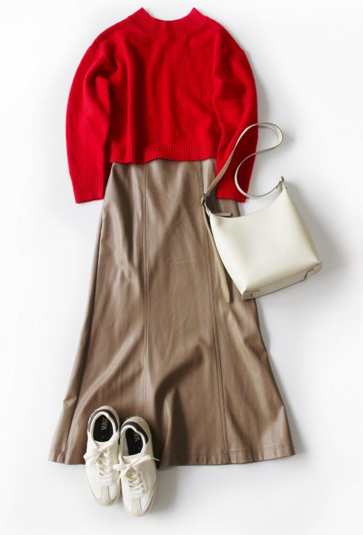 4色使ったコーデでも、ネックレスとバッグの白、バッグと靴の黒と「2ヶ所使う」を繰り返すことで、説得力のあるコーデに。バレンタインを彷彿とさせる赤×茶色は今年っぽい組み合わせ。ぜひトライしてみてください。