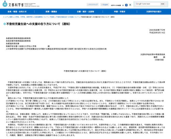 文部科学省も、2016年に全国の教育委員会に向けた通知「不登校児童生徒への支援の在り方について」にて、不登校児童生徒を支援する上での基本的な姿勢として下記のように記載しています。