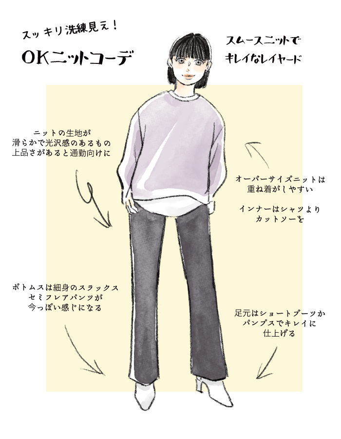 みなさん、こんにちは! ファッションスタイリスト&ライターの角佑宇子(すみゆうこ)です。昨年に続いて今年も暖冬とはいうものの、冬は冬。普通に寒い。とくに冷え込みが厳しい日の通勤コーデに欠かせないのが「冬ニット」ですよね。しかし着こなしがダサく見えたり、日中の暖かい室内での温度調節が難しかったりと、何かと苦戦しやすいアイテムでもあります。そこで今回は、ダサ見え・温度調節など悩みの多い冬ニットの通勤コーデテクニックをご紹介します。