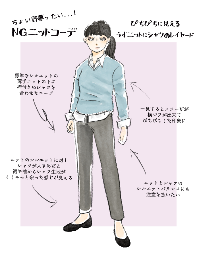 気をつけたいのが、薄手のニットと襟つきシャツの組み合わせ。定番のVネックの薄手ニットは通勤コーデにも最適ですが、重ね着には向いていません。
