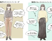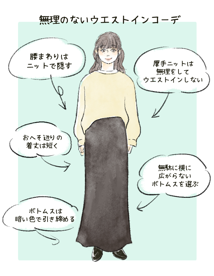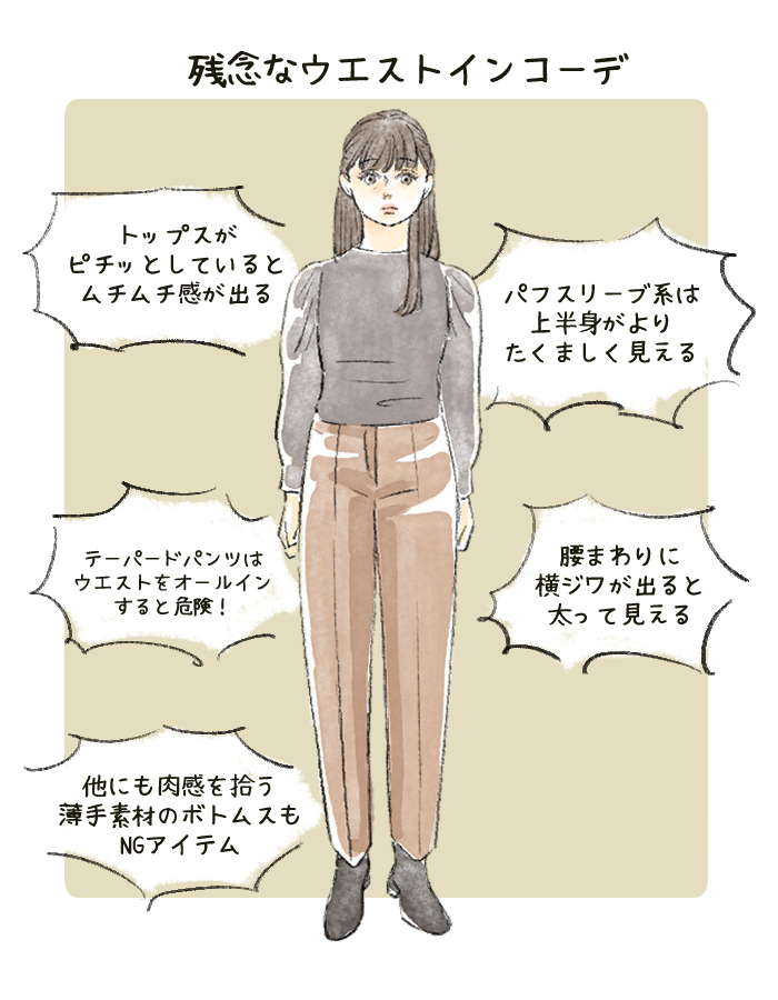 また着こなしの上で気をつけたほうが良いのは、ボトムスの選び方。ウエストインに向かないパンツは、テーパードパンツやスキニーパンツ。スカートではウエストゴムのギャザースカート、ストレッチ素材のタイトスカートです。