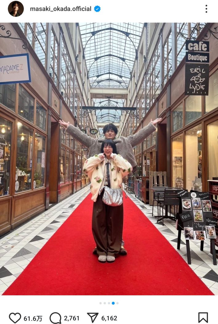 俳優の岡田将生が2月3日までに更新したInstagramが話題です。パリで撮った写真5枚の、4枚目にさりげなく高畑充希との2ショットが入っていたからです。2024年11月19日に結婚した2人の初のツーショットに、「え?さらっと初公開!?」「お似合いすぎてしんどい」など、ファンは大興奮です。