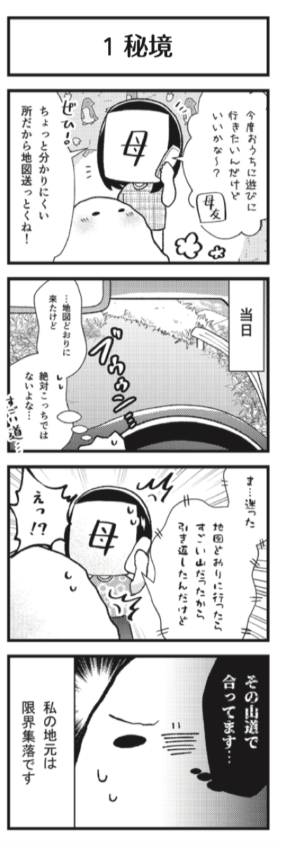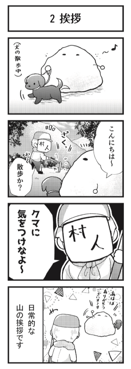 よくよく考えれば緊迫感のある「クマ挨拶」や、ベンチで休むおばあさんがオシャレアイテムよろしく「鎌を持っている」など、場所が違えば職質案件なエピソードの数々。うどん粉さんのあたたかなまなざしが、笑いに変換してくれるのです。