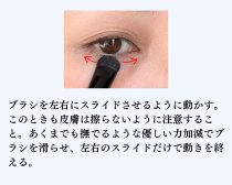 (3)(2)のブラシを上まぶたの中央目のキワに近い部分に置き、左右にスライドさせるようにしてアイシャドウを塗る。その状態で少しずつ上に塗り広げ、アイシャドウを塗りたい部分意外にはできるだけはみ出さないようにする。