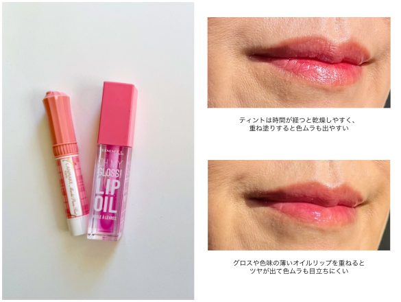 色は定着しているので、ツヤのがプラスされると、メイク仕立ての唇を再現できるし、色ムラと乾燥の両方を回避することもできます。