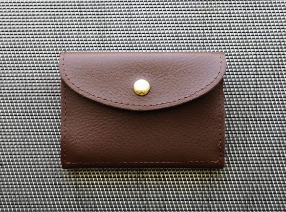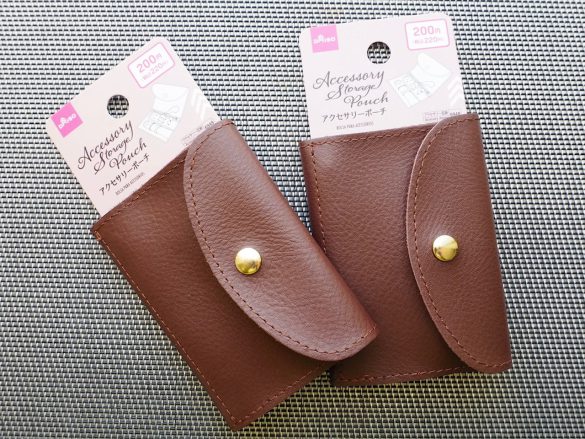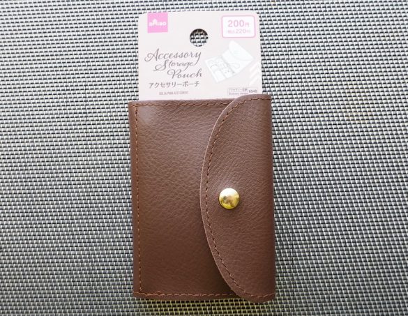 筆者が購入したのは、ブラウンの「アクセサリーポーチ」。やや赤みがかった深みのあるカラーと表面のゴールドボタンは、220円という価格以上に見えます。