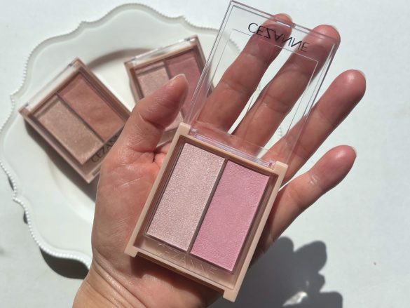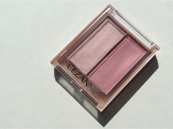 「セザンヌ フェイスグロウカラー」は、指で触れるとぷにっとした生っぽい質感のフェイスカラーパレット。ハイライトと血色カラーの2色入りで、ハイライトやチークとして使えるだけでなく、アイメイクにも使うことができます。