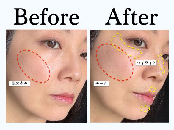 上の画像はトーンアップ効果のある化粧下地にファンデを薄く重ねてチークを塗っていない状態がBefore、チークとハイライトを塗った後の状態がAfterになります。