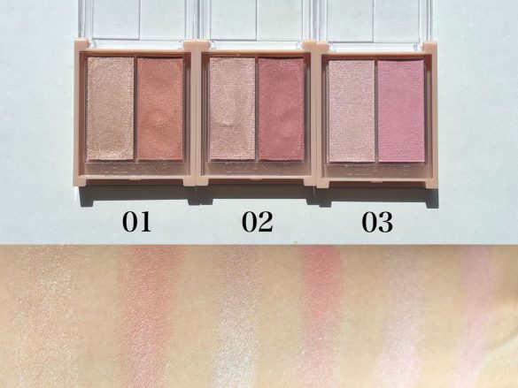 3色展開で既存色は、黄み寄りのカラーでヘルシーな印象に仕上がる「01 アプリコットグロウ」と、青み寄りのカラーで可愛らしい印象に仕上がる「02 ローズグロウ」。蛇足ですが、THREEに激似とバズったのは、「01 アプリコットグロウ」です。