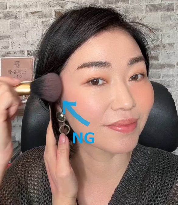 それは、昭和を彷彿とさせるような「頬から頬骨に沿ってナナメに引き上げる」バブル期~1990年代に流行っていたような塗り方です。かつ濃いめの色だとなおさら昭和感が出てしまいます。40~50代の方だと若い頃にナナメ塗りが流行でしたが、今も続けていたら要注意です。