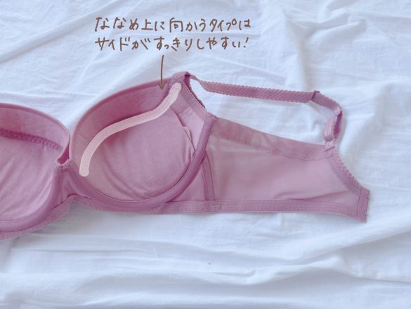 さらにもう一つ、締め付けが少ない秘密は…ちょっと変わったボーン。通常のブラのように縦に入っているのではなく、ワイヤーからアンダー部分の下辺に向かって斜めに入っているので、支えながらも圧迫感が少ないんです。