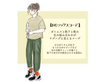 避けたいのは、靴下の色とスニーカーの色、コーデの配色が絶妙にミスマッチを起こしているスタイル。例えばアースカラーのボトムスにビビッドカラーの靴下、スニーカーはモノトーンなど、色が多色な上に系統もチグハグだと統一性がなくオシャレさが削がれてしまいます。
